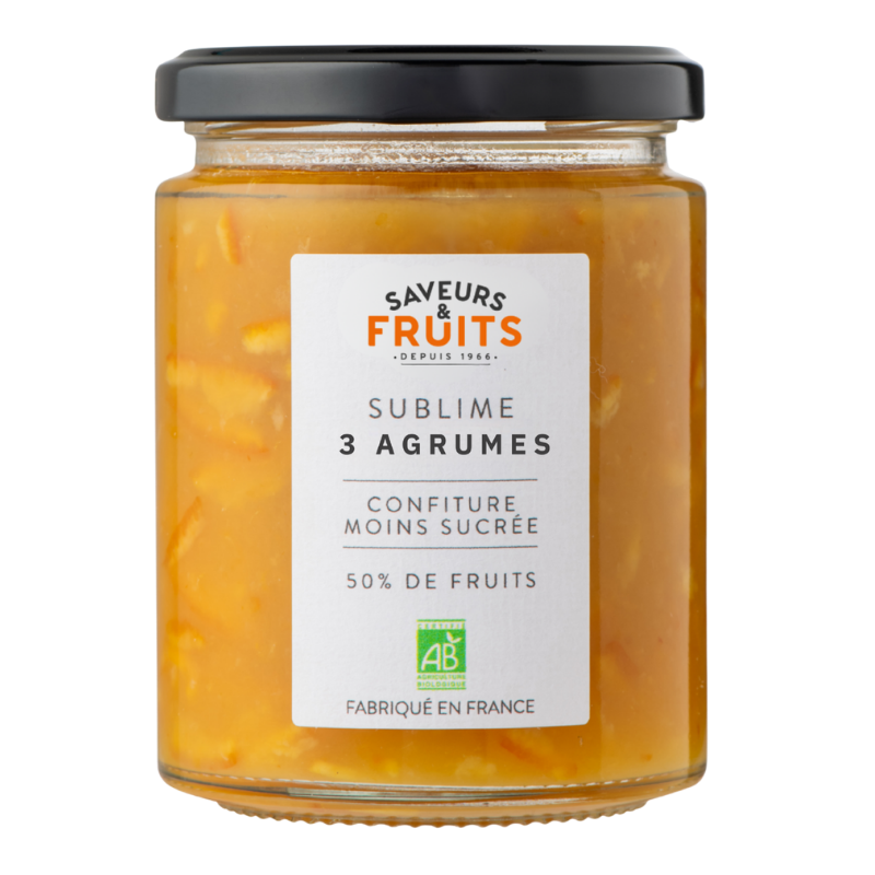 Découvrez notre confiture bio de 3 agrumes (orange, clémentine et citron), moins sucrée (33 % de sucre en moins) et plus riche en fruits (65 %). Un goût intense et acidulé, idéal pour un petit-déjeuner plus léger.